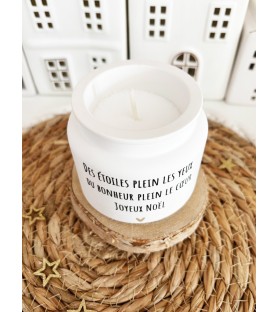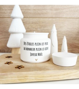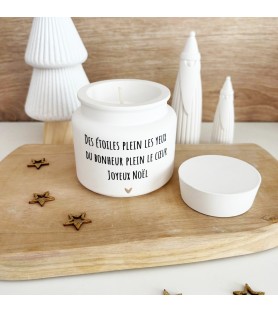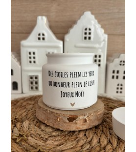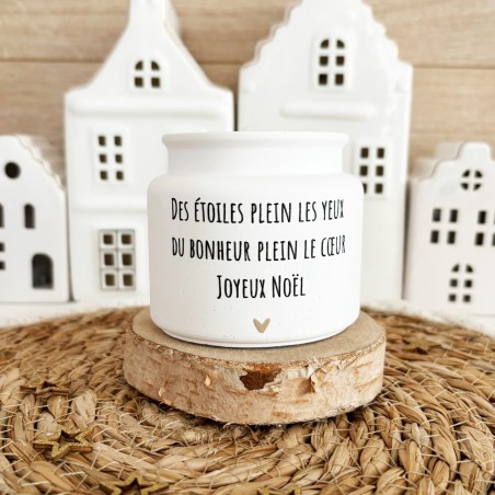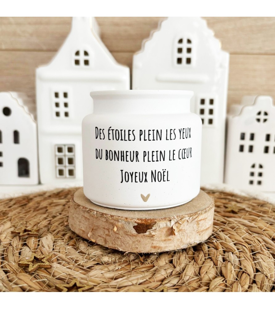 Orné du message “Des étoiles plein les yeux, du bonheur plein le cœur, Joyeux Noël”, ce petit pot diffuse une ambiance douce et lumineuse, parfaite pour la saison des fêtes.