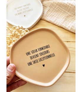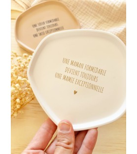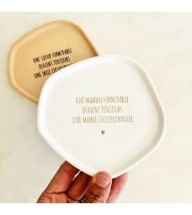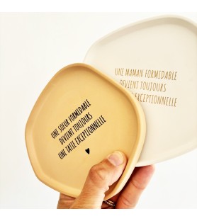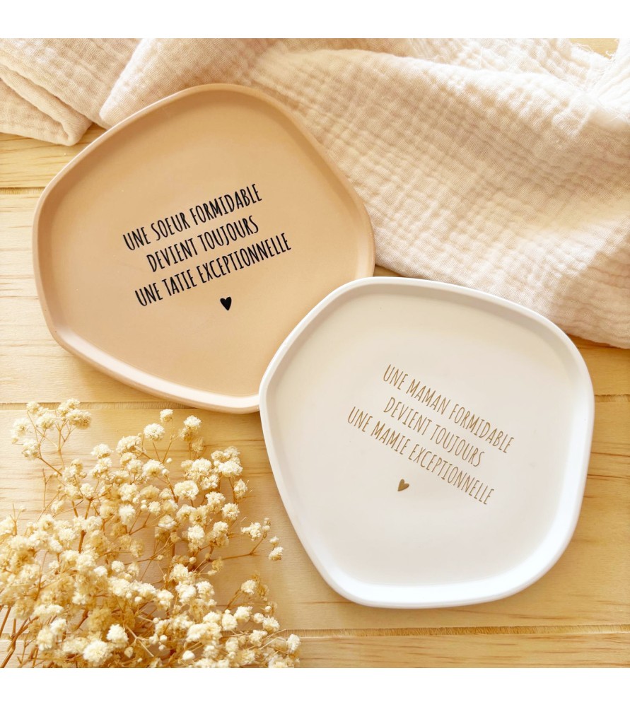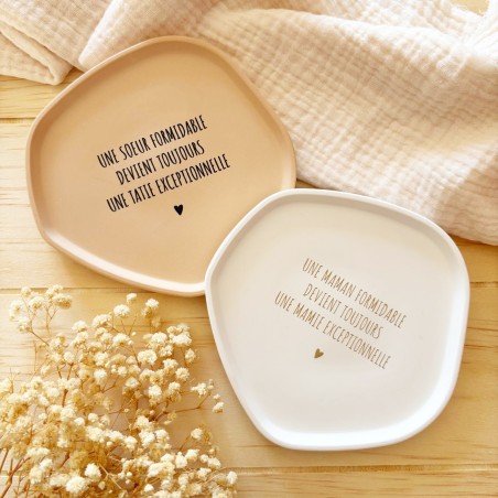 Coupelle artisanale fabriquée à la main en résine naturelle et pigments. Disponible en deux coloris et deux textes au choix, idéale comme cadeau pour une maman, une sœur ou pour annoncer une grossesse de manière originale.
