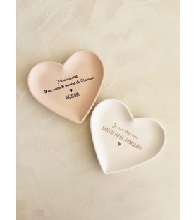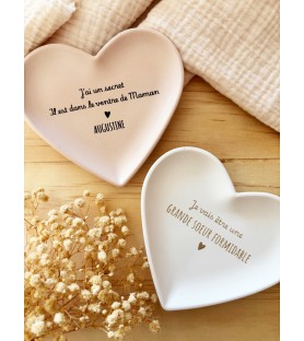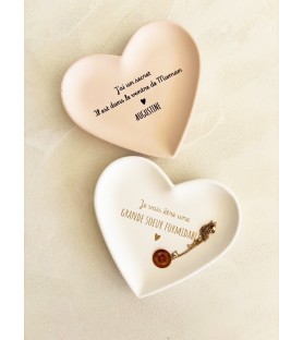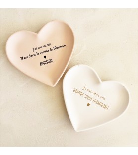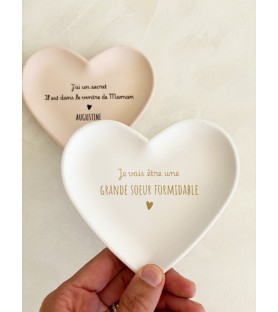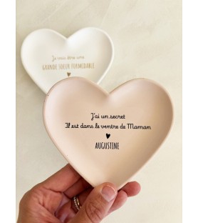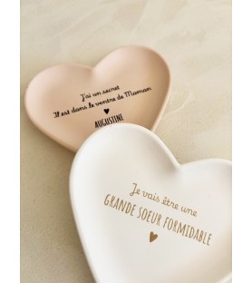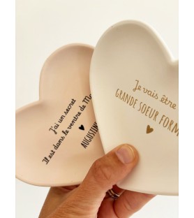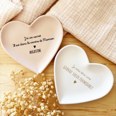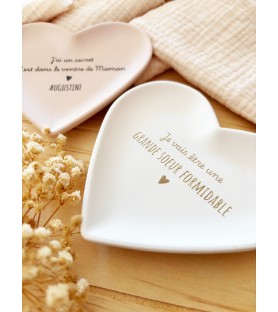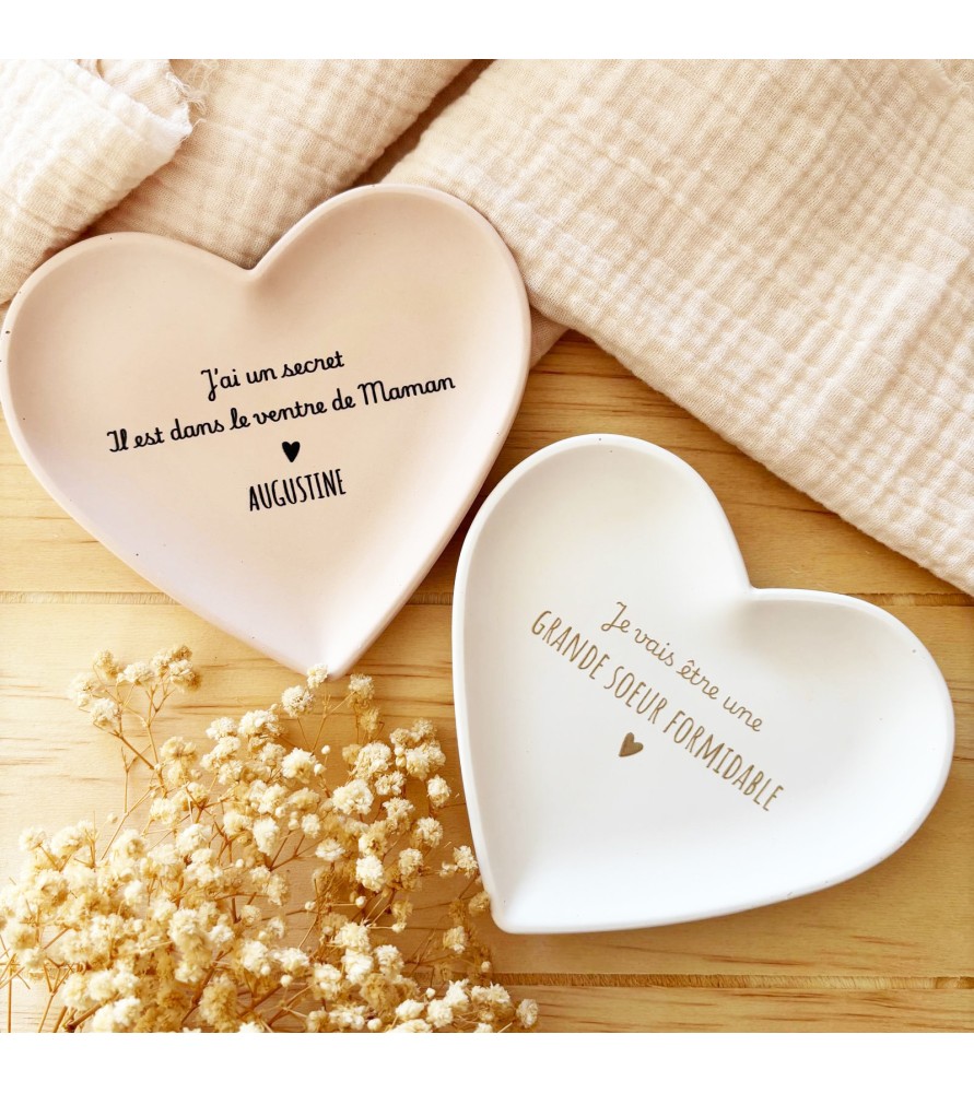 Cette coupelle en forme de cœur est un cadeau tendre et plein d’émotion pour annoncer une grossesse de façon originale. Délicate et raffinée, elle existe en deux versions pour s’adapter à chaque moment unique de la vie de famille. La première permet de glisser un doux secret avec le message « J’ai un secret, il est dans le ventre de Maman », personnalisable avec le prénom de l’enfant qui fait l’annonce. La seconde version met en valeur l’arrivée d’un petit frère ou d’une petite sœur avec l’inscription « Je vais être une grande sœur formidable » ou « Je vais être un grand frère formidable ».