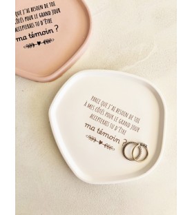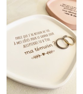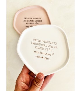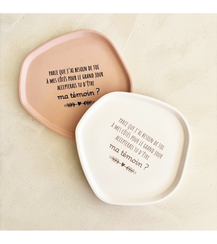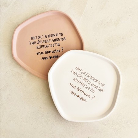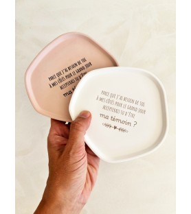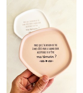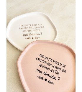 Une coupelle artisanale en résine naturelle, disponible en rose avec écriture noire ou en blanc avec écriture brun rosé. Un cadeau original et raffiné pour demander à une amie de devenir témoin ou demoiselle d’honneur.