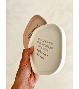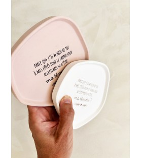 Disponibles en deux versions, rose avec écriture noire ou blanc avec écriture brun rosé, elles s’intègrent facilement dans la décoration d’un intérieur. Elles peuvent servir de vide-poches élégants, de coupelles à bijoux, de support à bougie ou simplement de souvenirs symboliques. Équipées de patins antidérapants, elles restent bien stables et protègent vos surfaces. Elles supportent la chaleur, ce qui permet d’y poser une bougie, mais ne doivent pas être en contact permanent avec de l’eau.