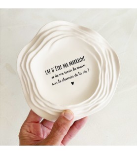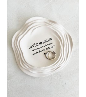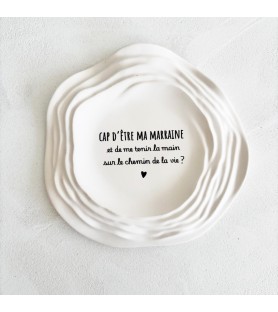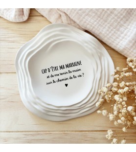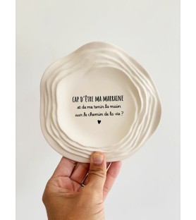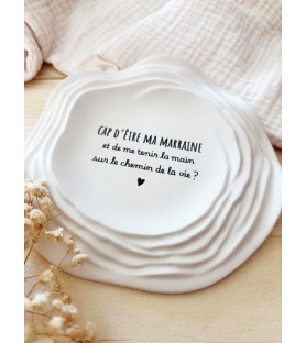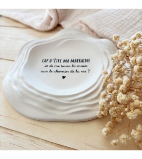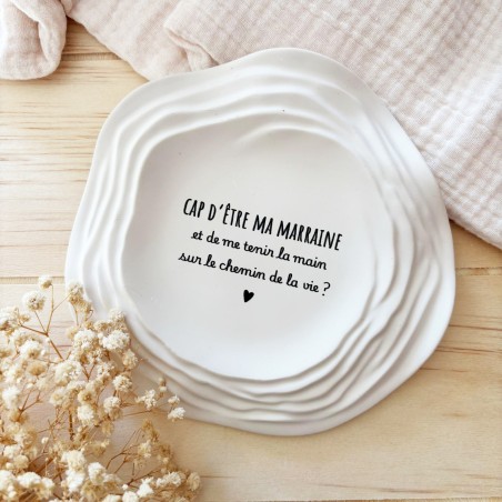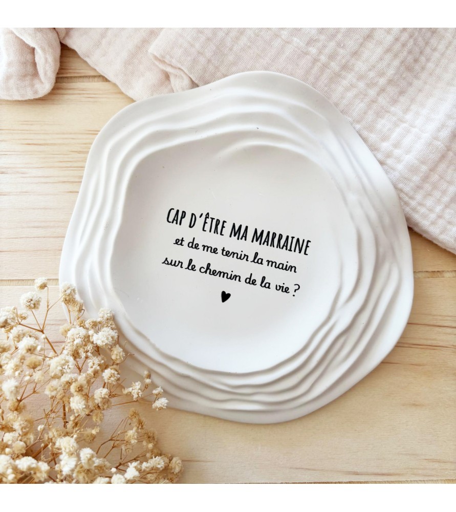 Une coupelle délicate et symbolique pour formuler une demande marraine inoubliable. Entièrement réalisée à la main en résine naturelle, elle affiche le message :