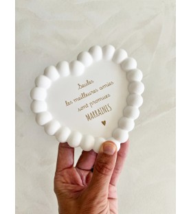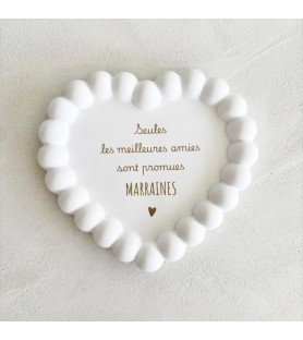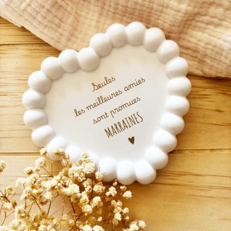 1 coupelle cœur en résine, coloris blanc, avec le message « Seules les meilleures amies sont promues marraines ».