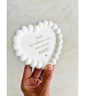 Cette coupelle en forme de cœur est une attention douce pour faire une jolie demande à la future marraine ou lui offrir un souvenir plein de sens. Réalisée à la main en résine naturelle, elle affiche le message « Seules les meilleures amies sont promues marraines » en lettres dorées, au centre d’un élégant pourtour perlé.