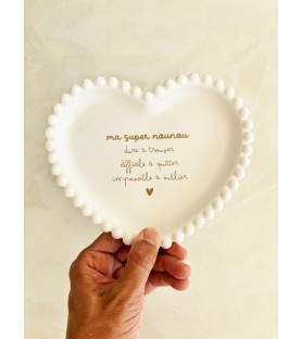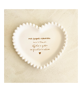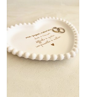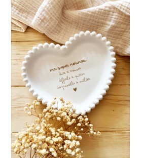 Cette jolie coupelle en forme de cœur perlé est décorée d’un message plein de douceur et d’affection. Elle existe en deux versions au choix :