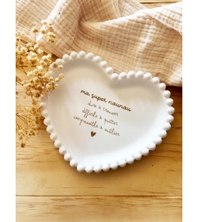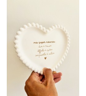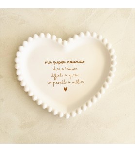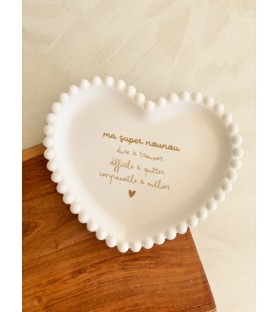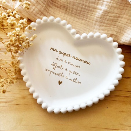 Offrez un cadeau tendre et plein de symbolique à une nounou ou une tata exceptionnelle avec cette coupelle en forme de cœur perlé. Élégante et pratique, elle peut servir de vide-poches, de repose-bijoux ou simplement d’objet décoratif chargé d’émotion.
