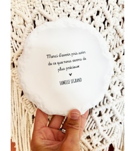 Chaque pièce est personnalisée avec soin, avec le message et le nom de votre choix, pour créer un souvenir qui fera plaisir à coup sûr. Grâce à sa fabrication en résine naturelle, elle est à la fois solide et élégante. Son design aux bords délicatement texturés apporte une touche chaleureuse et authentique à votre décoration.