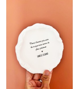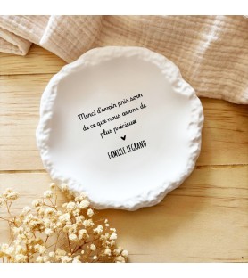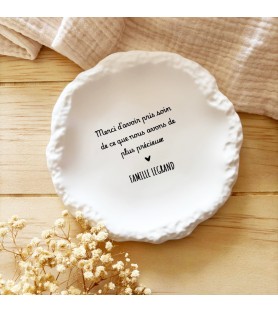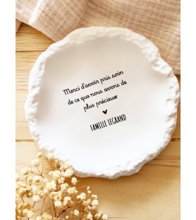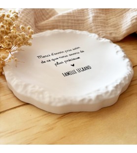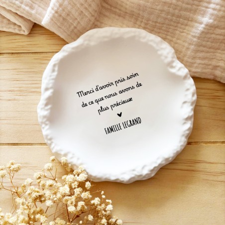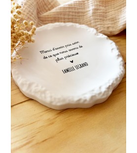 Une jolie coupelle en résine artisanale, personnalisée avec votre message pour offrir un cadeau unique et plein d’émotion à une nounou ou une maîtresse.