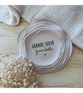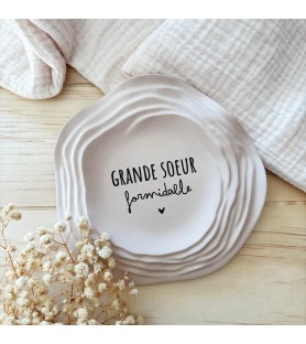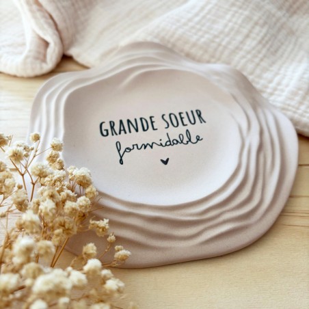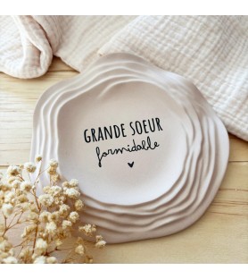 Une coupelle artisanale en résine avec le tendre message « Grande sœur formidable ». Un cadeau original pour faire plaisir à une sœur, ou pour annoncer une grossesse de façon unique et émouvante.
