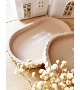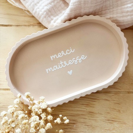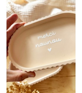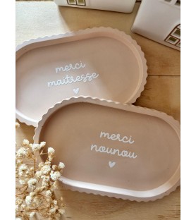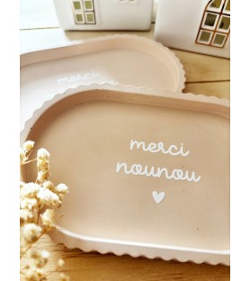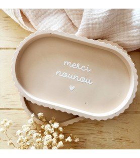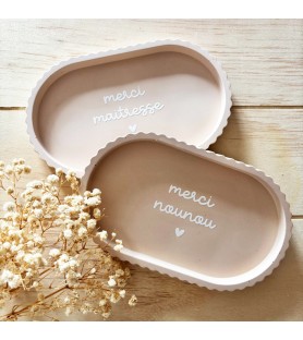 Coupelle artisanale en résine naturelle, de coloris brun orangé, disponible avec trois inscriptions au choix : « merci nounou », « merci tata » ou « merci maîtresse ». Un cadeau raffiné et pratique pour exprimer sa gratitude.