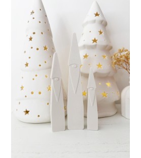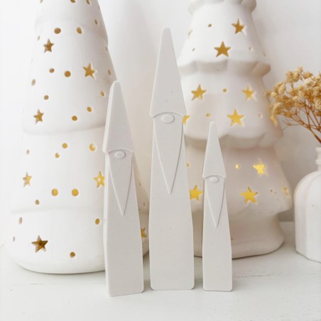 Ces figurines décoratives, déclinées en trois tailles (15 cm, 12 cm et 10 cm), s’intègrent aussi bien sur une table de fête, une étagère ou au pied du sapin.