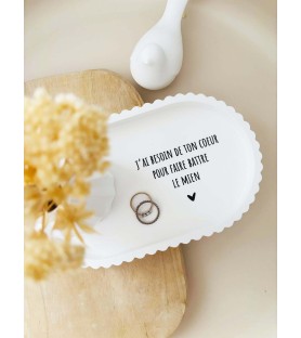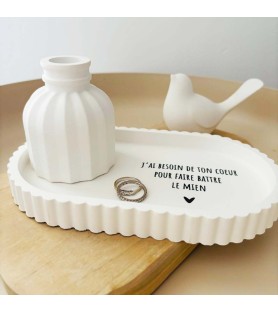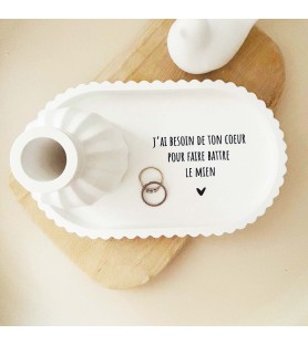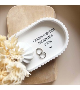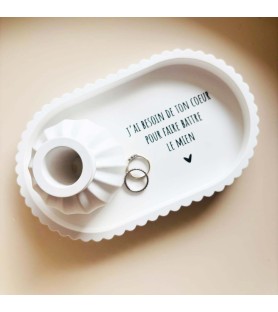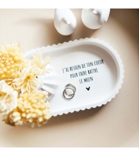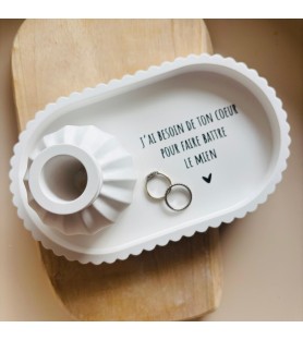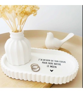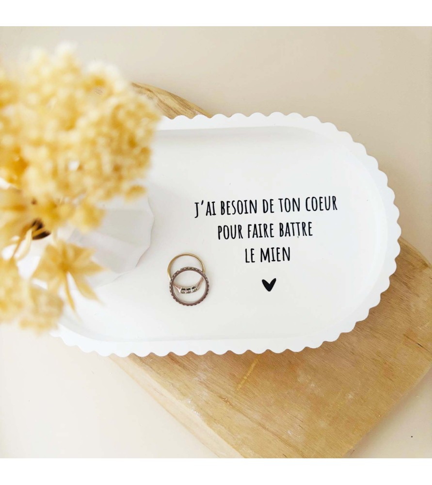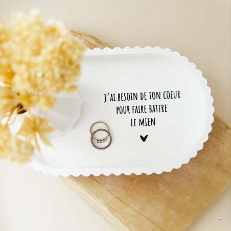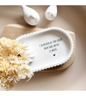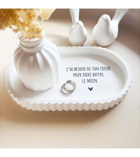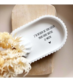 Cet ensemble décoratif a été imaginé comme une ode à l’amour et à la connexion entre deux êtres. La coupelle blanche est délicatement ornée du message « J’ai besoin de ton cœur pour faire battre le mien », une phrase forte et poétique qui exprime le lien profond, l’évidence et la tendresse partagée. Elle devient naturellement un objet chargé d’émotion, à poser dans une entrée, une chambre ou un espace intime.