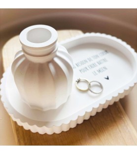 Avec ses dimensions d’environ 20 cm de long pour 12 cm de large, la coupelle offre un bel espace pour accueillir bijoux, alliances, petits souvenirs ou objets du quotidien. Elle s’associe harmonieusement à un petit vase assorti, aux lignes douces et épurées, qui complète l’ensemble avec élégance.