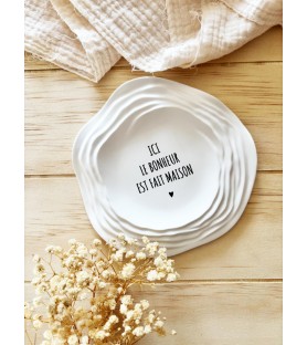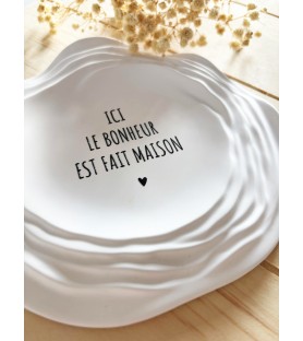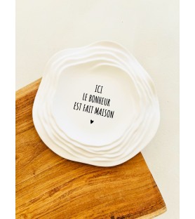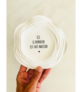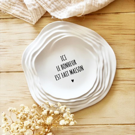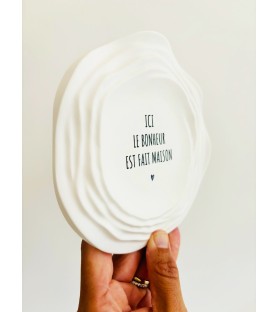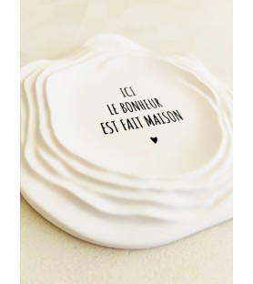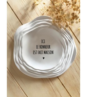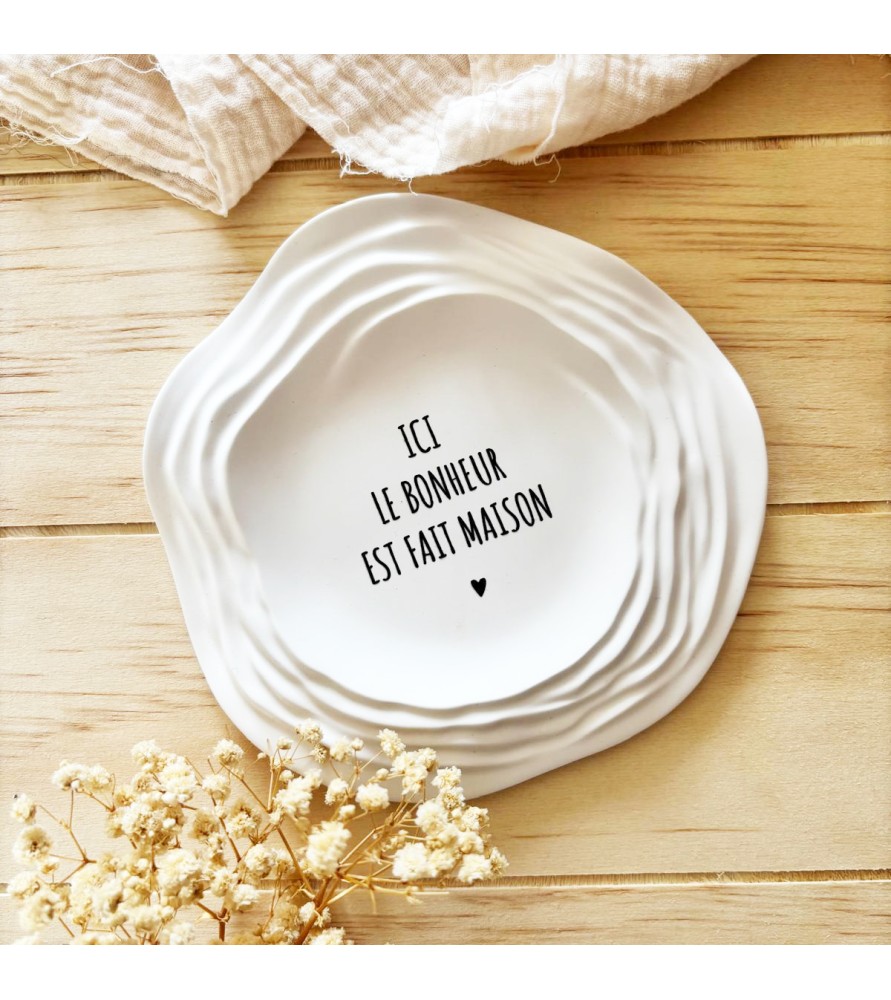 Une coupelle artisanale avec l’inscription "Ici le bonheur est fait maison". Idéale comme objet déco ou vide-poche, à offrir en cadeau ou à s’offrir pour embellir son intérieur.
