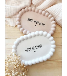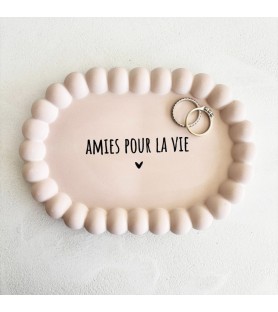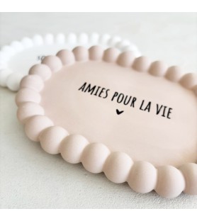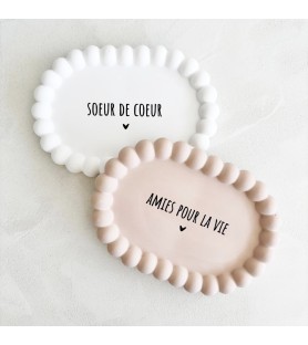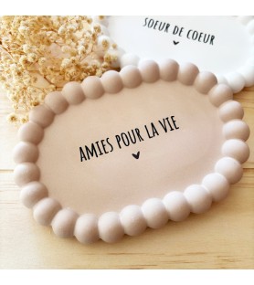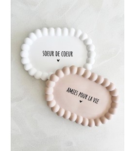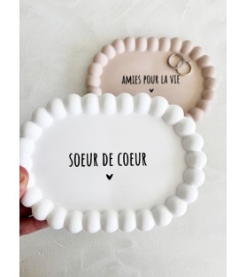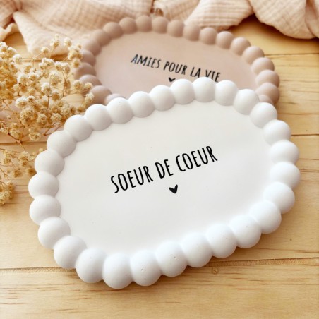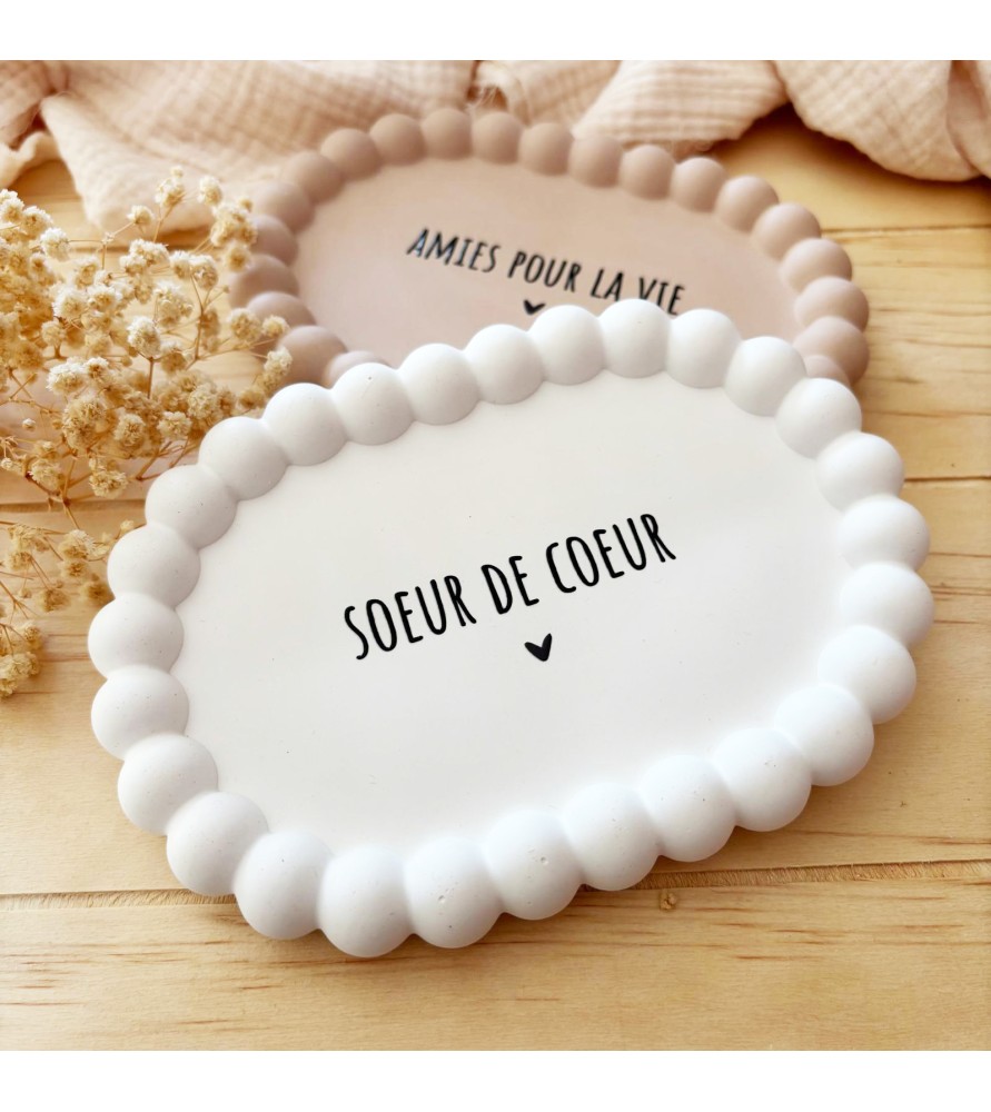 Une coupelle délicate et intemporelle pour célébrer un lien précieux entre amies. Entièrement réalisée à la main en résine naturelle, elle arbore son joli message « Sœur de cœur » ou "Amies pour la vie"