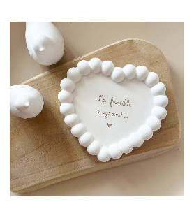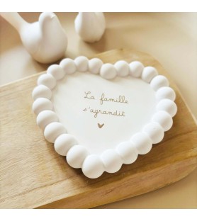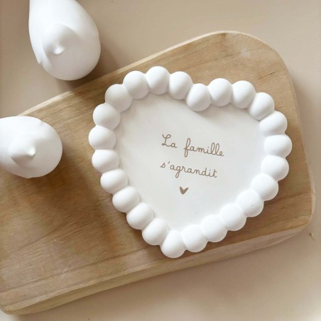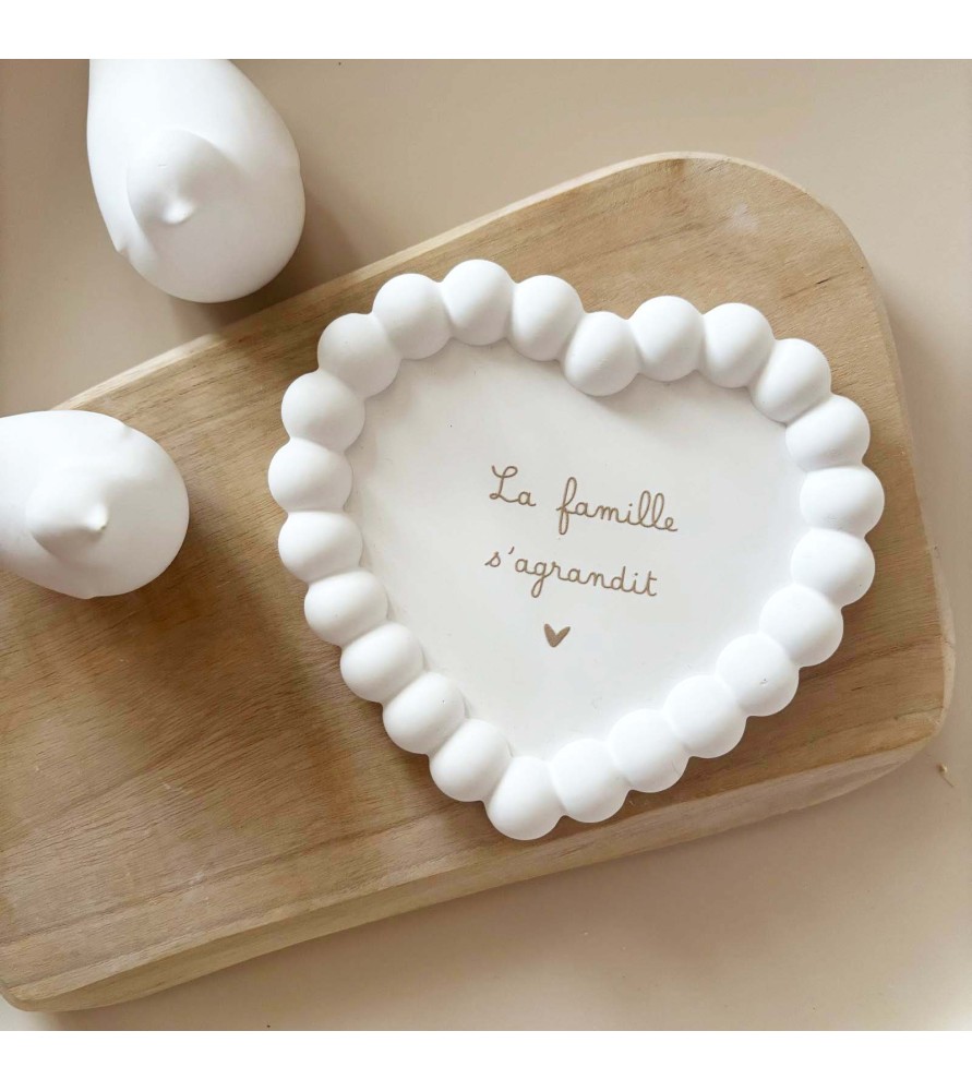 Coupelle décorative en forme de cœur perlée, réalisée à la main en résine naturelle blanche, avec l’inscription « La famille s’agrandit » en beige doré. Une création délicate pour annoncer un heureux événement.