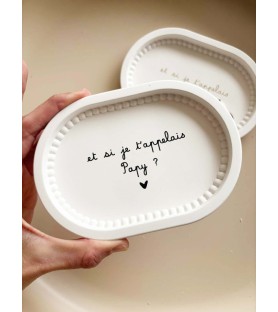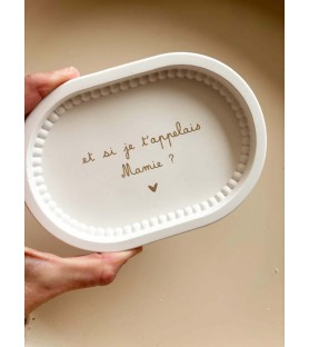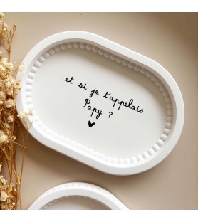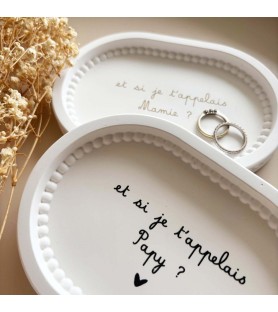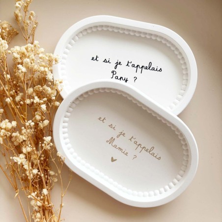 Cette coupelle ovale au délicat bord perlé a été imaginée pour accompagner les annonces les plus précieuses. Elle permet de révéler une grossesse de façon douce et originale, tout en laissant un souvenir durable à la personne qui la reçoit.