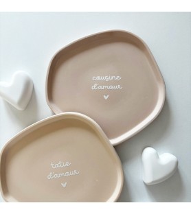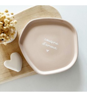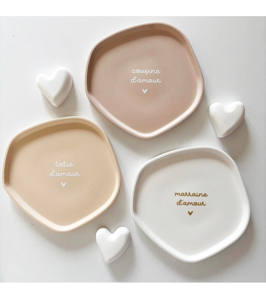 Une délicate coupelle artisanale en résine naturelle, déclinée en trois teintes douces et personnalisable avec le texte de votre choix : marraine d’amour, tatie d’amour, mamie d’amour, cousine d’amour… Un cadeau tendre et symbolique signé Atelier Roz & Lou.