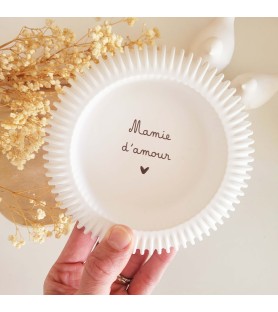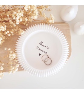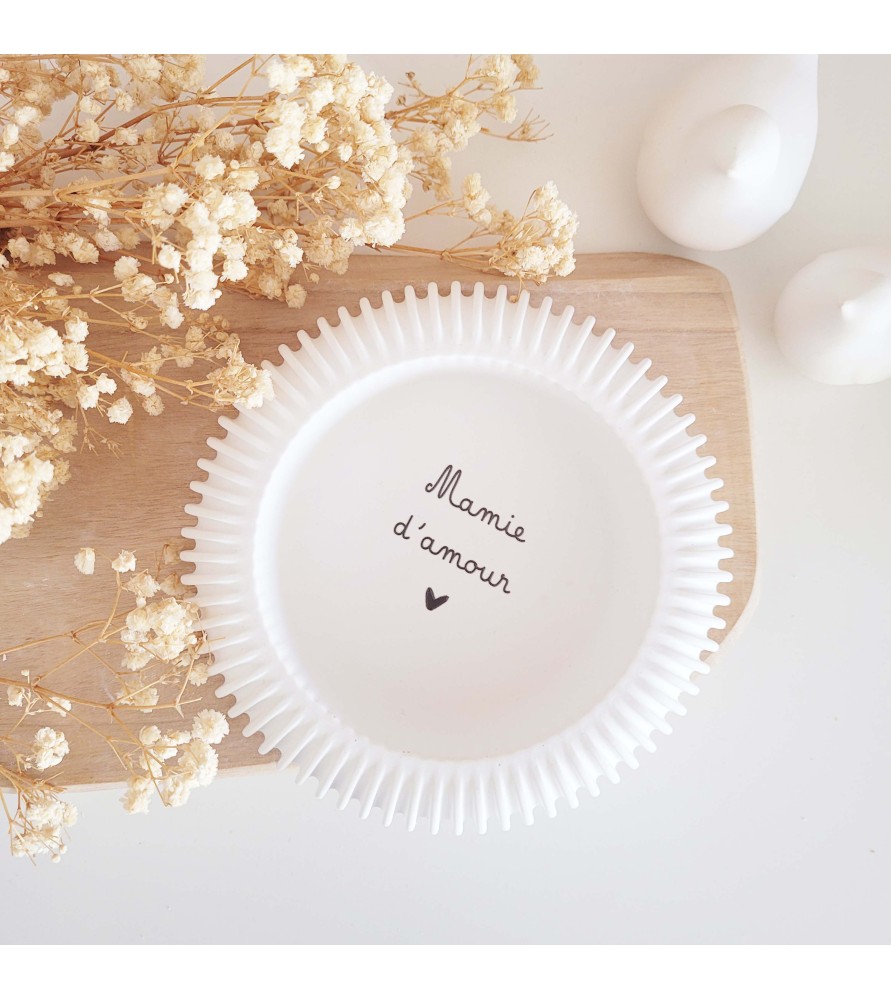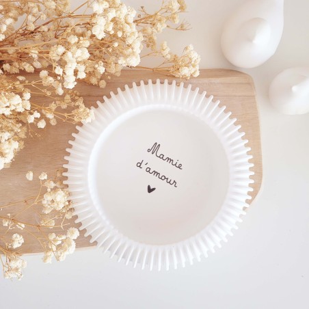 Cette coupelle ronde se distingue par ses lignes striées délicates sur les côtés, qui lui apportent un style à la fois moderne et doux. Sa forme généreuse et sa belle profondeur permettent d’y déposer bijoux, petits objets du quotidien ou souvenirs précieux. L’inscription intérieure « Mamie d’amour », apposée en noir, en fait un cadeau symbolique et chargé d’émotion.