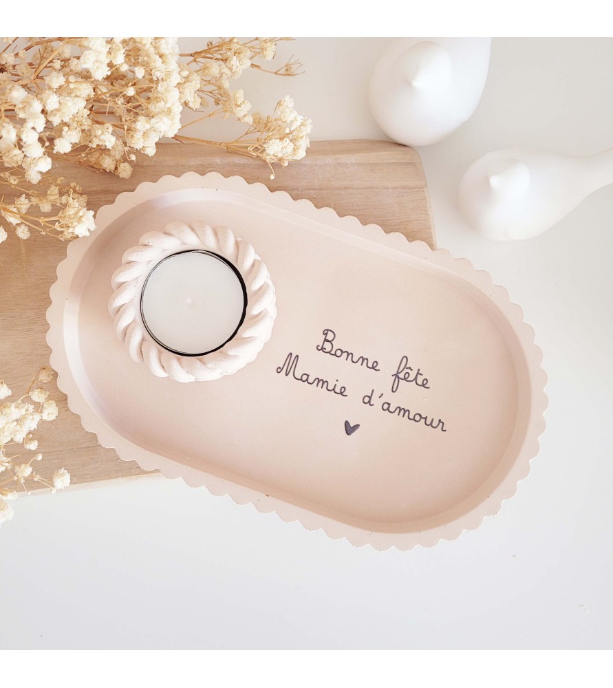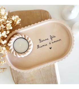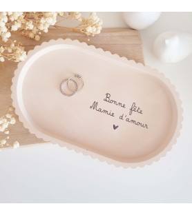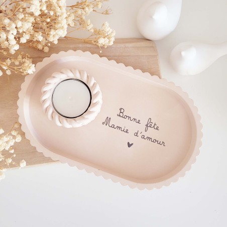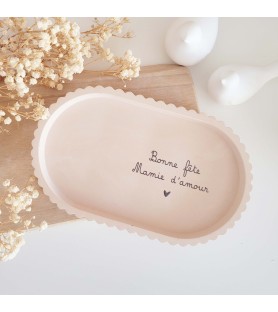 Le plateau, aux lignes douces et au bord fantaisie, est fabriqué à la main dans une résine naturelle aux nuances beige rosé. Il est orné d’une inscription tendre, au choix : « Bonne fête maman d’amour » ou « Bonne fête mamie d’amour », inscrite en noir pour un rendu élégant et lisible.