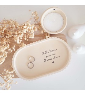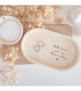La coupelle ovale, aux lignes douces et raffinées, est personnalisée avec le message « Mille bisous pour ma Mamie chérie », accompagné d’un petit cœur. Elle peut accueillir bijoux, petits objets du quotidien ou servir de joli plateau décoratif.