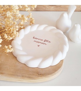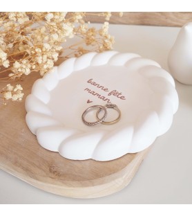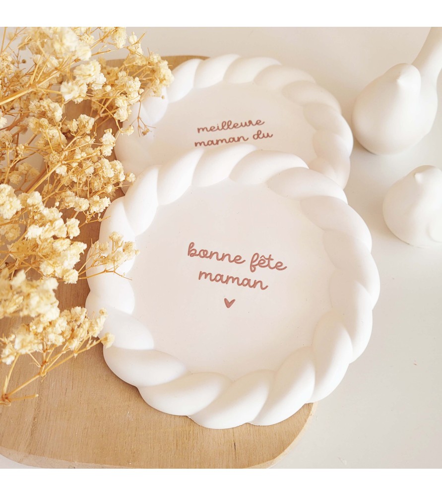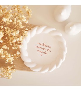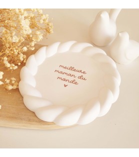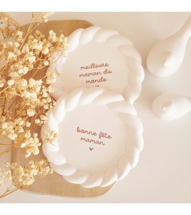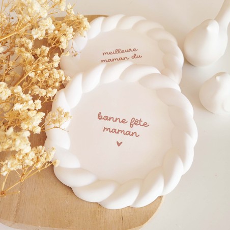 Une jolie coupelle ronde au bord délicatement torsadé, ornée d’un message tendre pour célébrer les mamans et les mamies. Un cadeau plein de douceur à offrir pour la fête des mères, la fête des grands-mères ou simplement pour dire je t’aime.