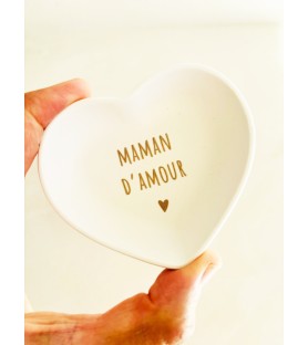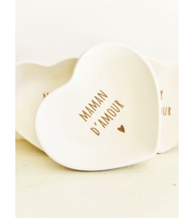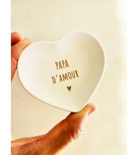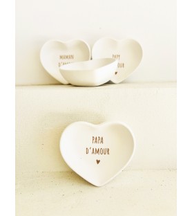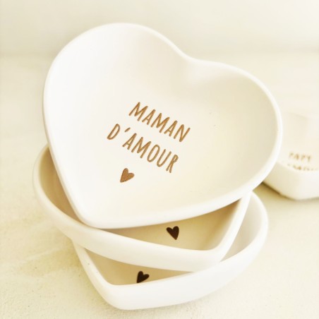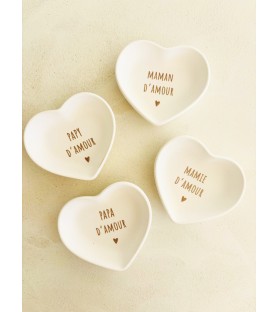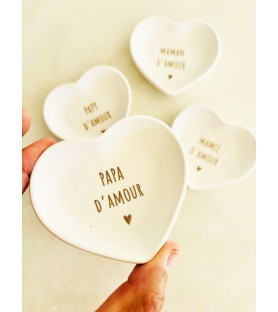 Une petite coupelle en résine naturelle en forme de cœur, avec inscription au choix : Maman d’amour, Papa d’amour, Papi d’amour… Le cadeau idéal pour la famille, à offrir à Noël, pour un anniversaire, une fête ou pour annoncer une jolie nouvelle.