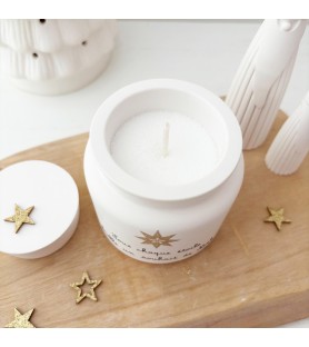 Un pot-bougie élégant en résine naturelle blanche, fabriqué à la main, vendu avec sa cire en poudre et sa mèche réutilisable. Une décoration raffinée et durable à offrir ou à s’offrir pour Noël.