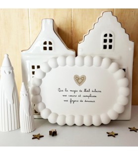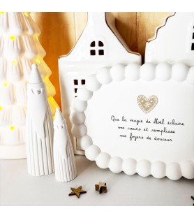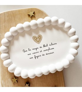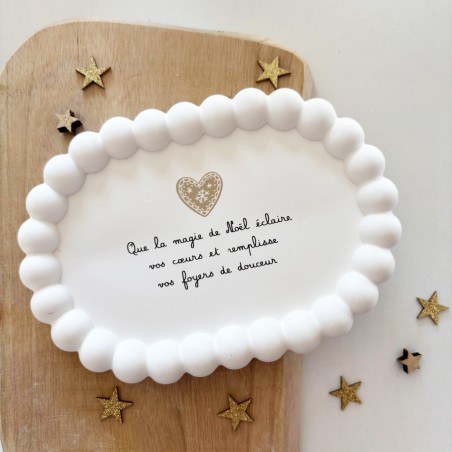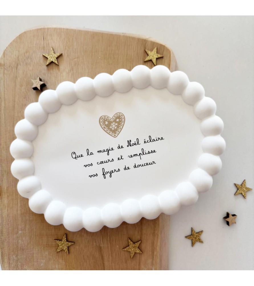 Une coupelle ovale en résine naturelle blanche, ornée d’un cœur doré et d’un doux message de Noël. Entièrement faite à la main, elle apporte une touche poétique et raffinée à votre décoration.