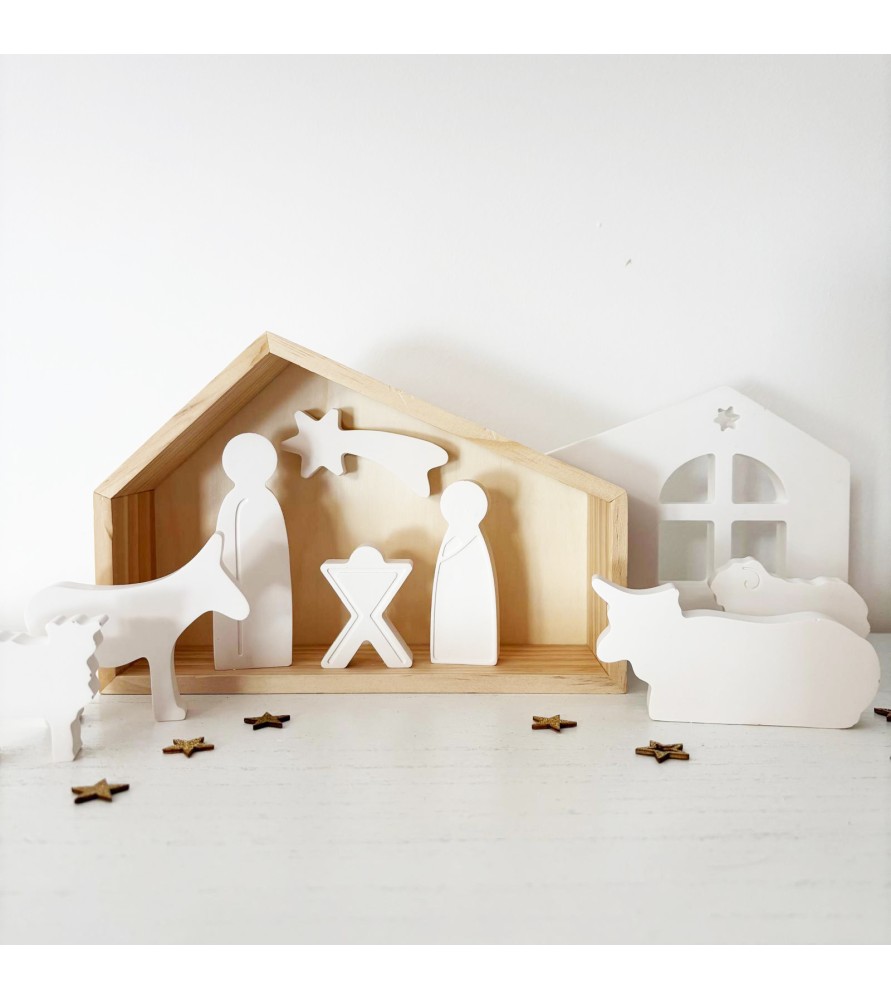 Une crèche artisanale minimaliste composée d’une cabane en bois, d’une façade en résine et de sept sujets façonnés à la main. Une décoration de Noël douce, chic et intemporelle.