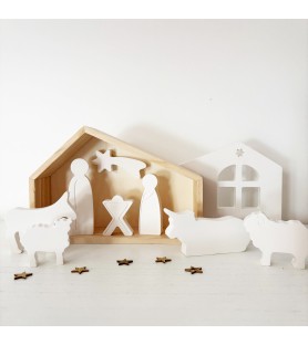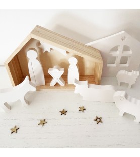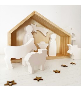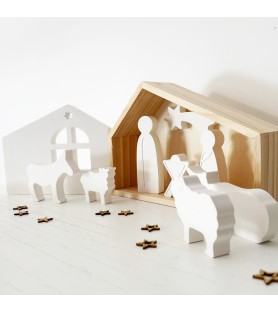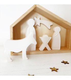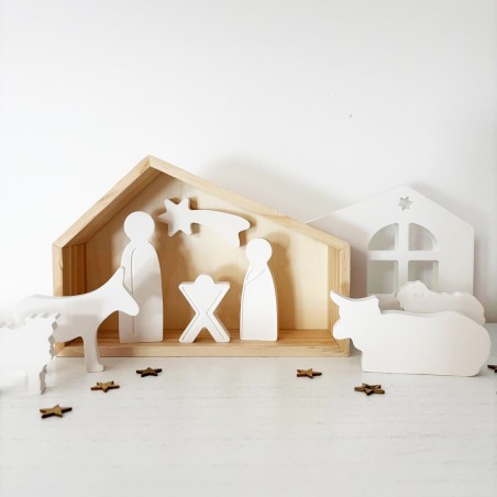 Le coffret se compose d’une cabane en bois naturel, d’une façade en résine ajourée, et de sept sujets emblématiques de la Nativité