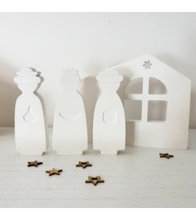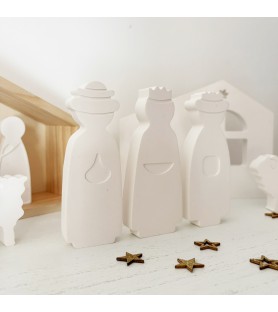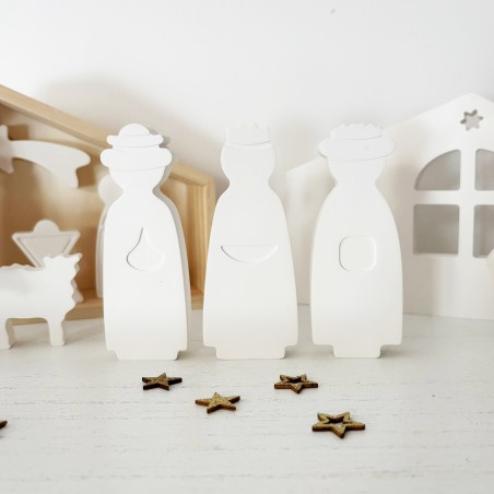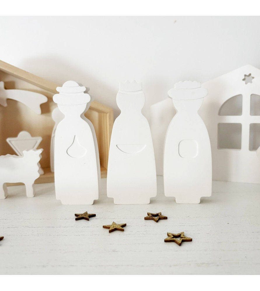 Lot de trois Rois mages en résine naturelle, fabriqués à la main pour compléter nos crèches artisanales. Des sujets minimalistes et poétiques, parfaits pour une déco de Noël douce et raffinée.
