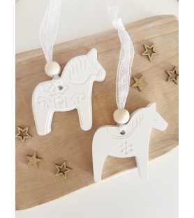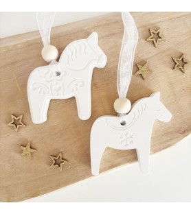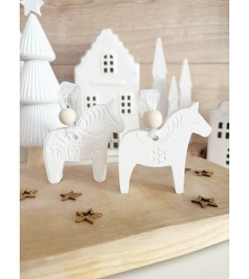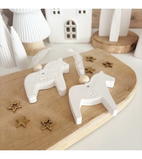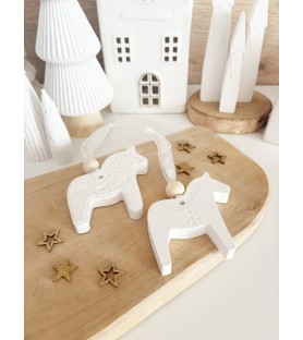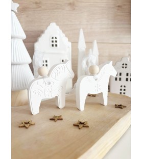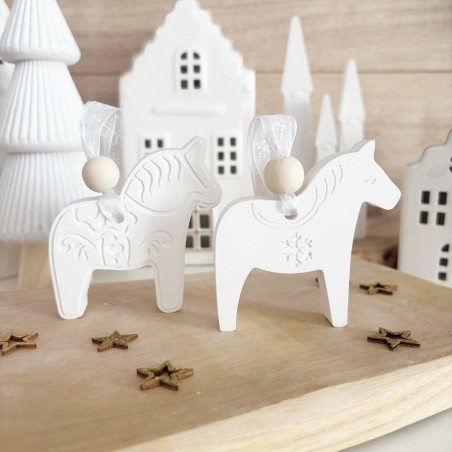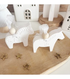 Ces petits chevaux mesurent 7 cm de haut et peuvent être posés sur une étagère, une table ou un rebord de cheminée, ou suspendus au sapin pour une touche de charme nordique. Leur teinte blanche et leur finition mate s’accordent parfaitement avec une ambiance naturelle, bohème ou chic.