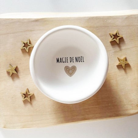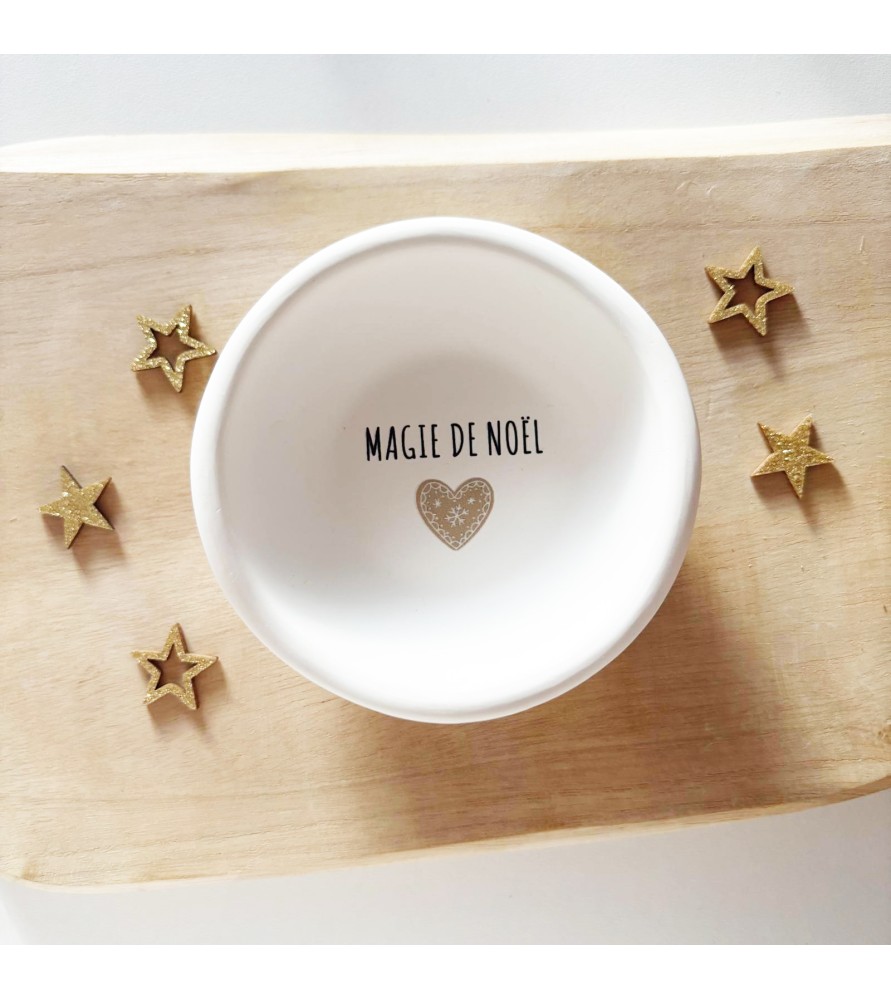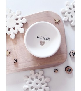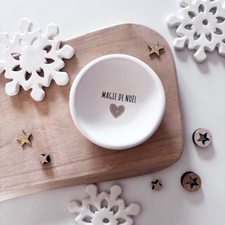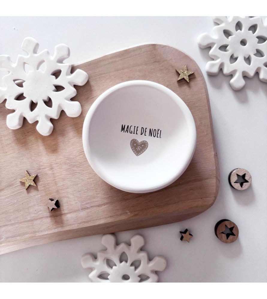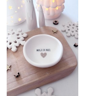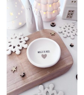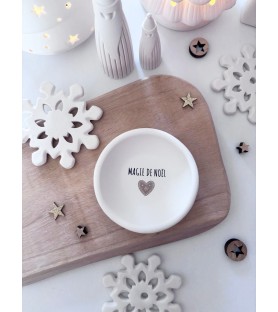Avec son inscription “Magie de Noël” et son délicat cœur doré, elle s’intègre parfaitement dans une décoration douce, épurée et chaleureuse. Son format pratique en fait un objet polyvalent : vide-poche, coupelle décorative, ou élément d’art de la table pour vos fêtes de fin d’année.