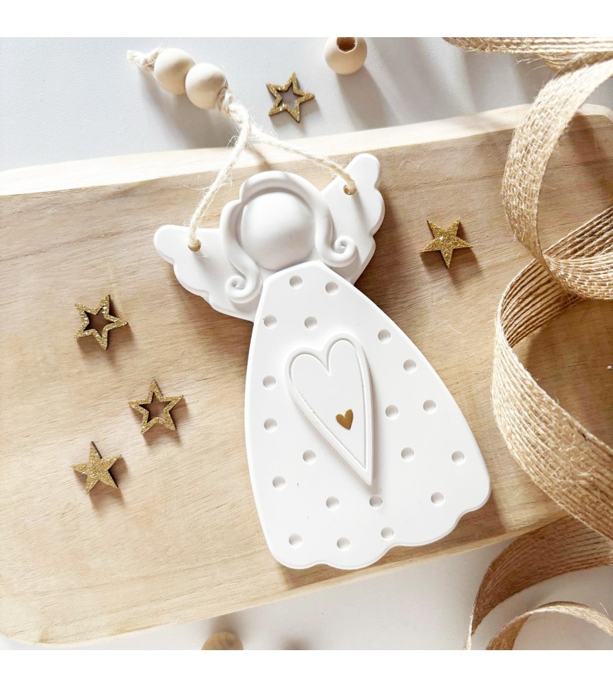 Apportez une touche douce et lumineuse à votre décoration avec cette suspension de Noël ange signée Atelier Roz & Lou Réalisée à la main en résine naturelle, cette création écoresponsable séduit par ses détails délicats et son cœur doré qui évoque la chaleur et la tendresse des fêtes.