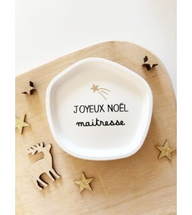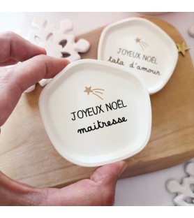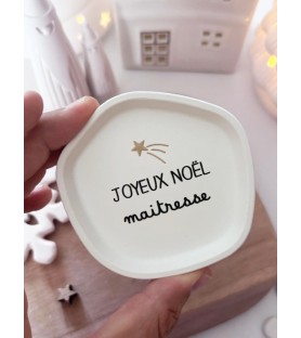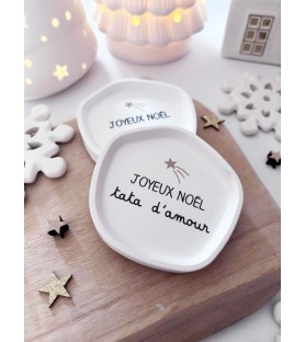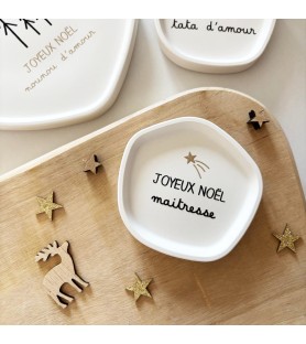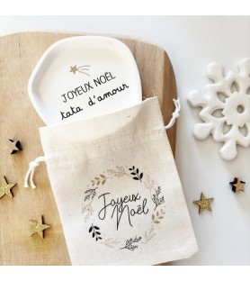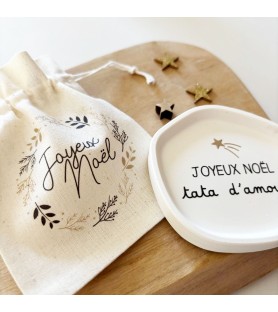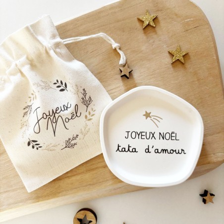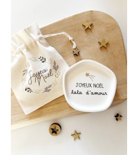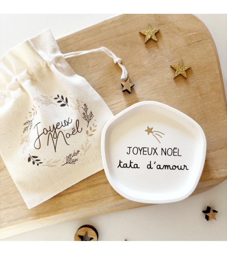 Coupelle artisanale en résine naturelle, signée Atelier Roz & Lou, gravée du message “Joyeux Noël”. Un cadeau personnalisé plein de douceur pour maîtresse, nounou, tata ou tatie, présenté dans un pochon en coton naturel “Joyeux Noël”.