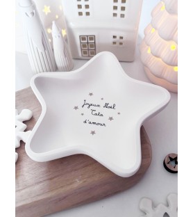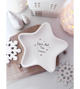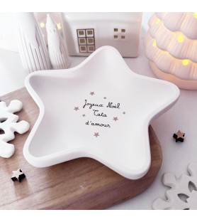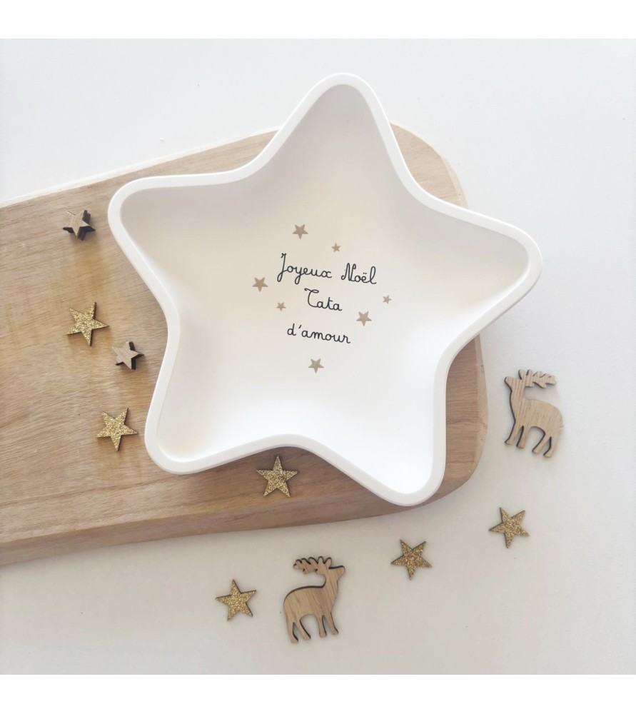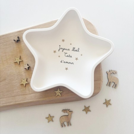 Coupelle en forme d’étoile réalisée à la main en résine naturelle, signée Atelier Roz & Lou. Personnalisable avec le message de ton choix : Tata d’amour, Mamie d’amour, Maman d’amour, Papi d’amour, Tatie d’amour... Un cadeau unique et plein de tendresse pour Noël.