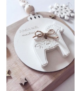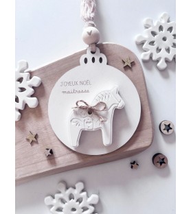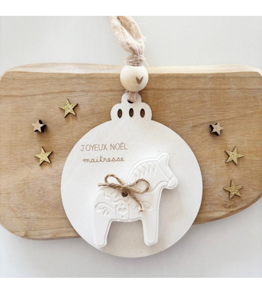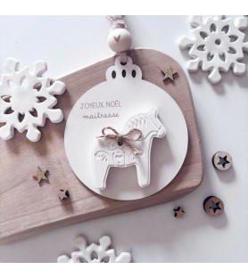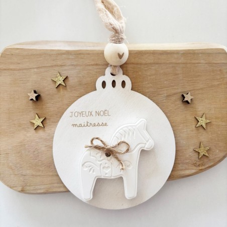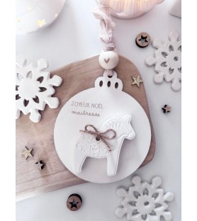 Une décoration de Noël douce et poétique, mêlant le bois naturel et la résine blanche. Chaque boule est décorée d’un petit cheval et d’un ruban en gaze de coton, pour un cadeau unique et plein de charme à offrir à une maîtresse, une nounou ou un proche.