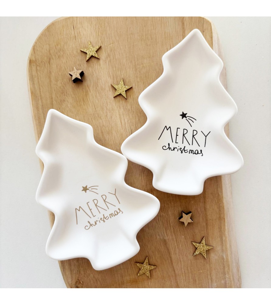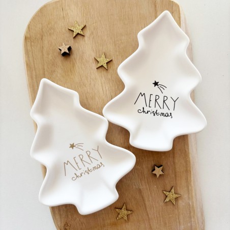 Apportez une note douce et lumineuse à vos fêtes avec cette coupelle en forme de sapin Merry Christmas, signée Atelier Roz & Lou.