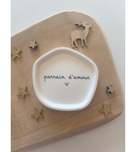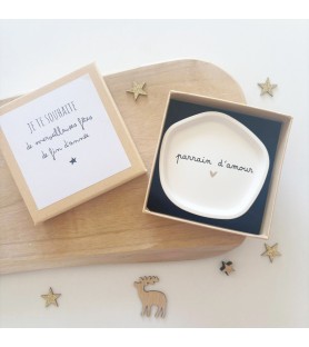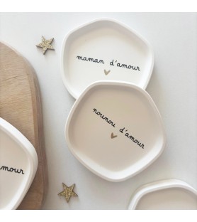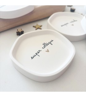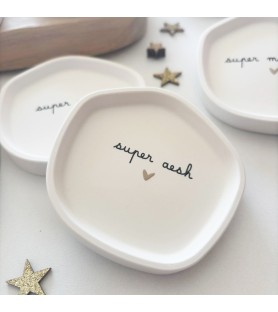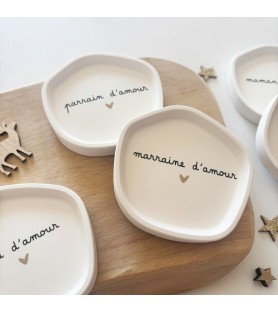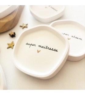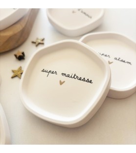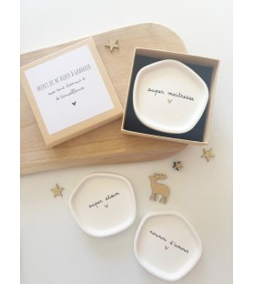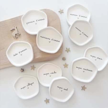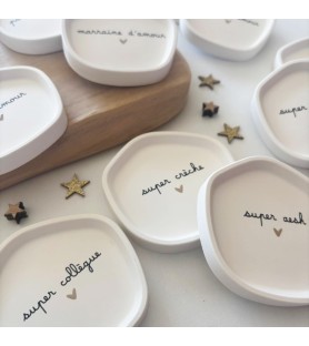 Quant à la coupelle (7,5 cm de diamètre), elle est disponible avec des dizaines de messages personnalisés : maîtresse, nounou, marraine, tata, collègue, maman, et bien d’autres…