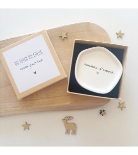 Un coffret cadeau unique et raffiné, composé d’une petite coupelle artisanale en résine naturelle présentée dans une boîte Kraft personnalisée. Un présent écoresponsable, fabriqué à la main avec soin, idéal pour offrir à Noël ou en fin d’année à toutes les personnes chères à votre cœur.