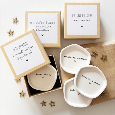 Un coffret tendre et unique pour faire une demande de marraine inoubliable : une coupelle façonnée à la main en résine naturelle, accompagnée d’un joli message plein d’émotion.