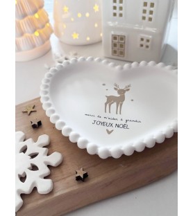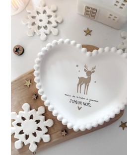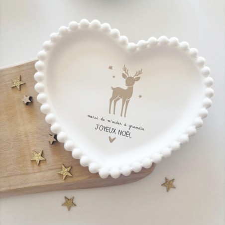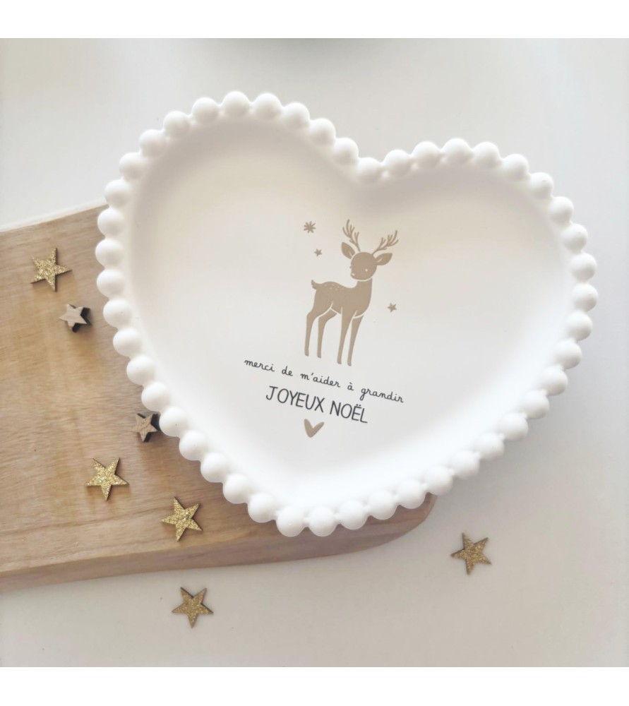 Une coupelle en forme de cœur ornée d’un adorable faon et du tendre message “Merci de m’aider à grandir – Joyeux Noël”. Une création artisanale signée Atelier Roz & Lou, parfaite pour remercier maîtresse, nounou ou ATSEM à l’occasion des fêtes.