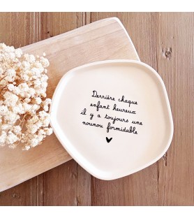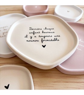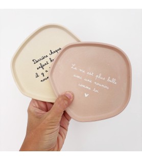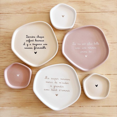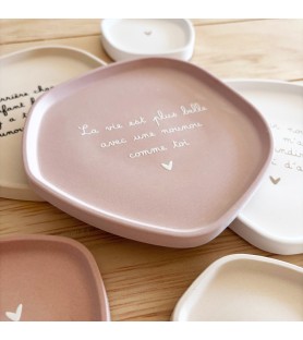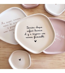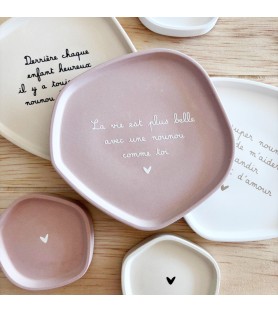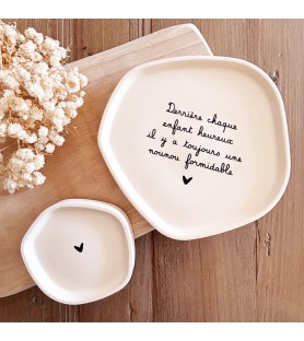Disponibles en trois harmonies de couleurs – beige avec texte noir, rose poudré avec texte blanc, et blanc avec texte beige doré – ces coupelles décoratives peuvent être offertes seules ou en duo. La grande coupelle présente un message tendre et inspirant, tandis que la petite, ornée d’un simple cœur, apporte une touche de douceur et de sobriété.