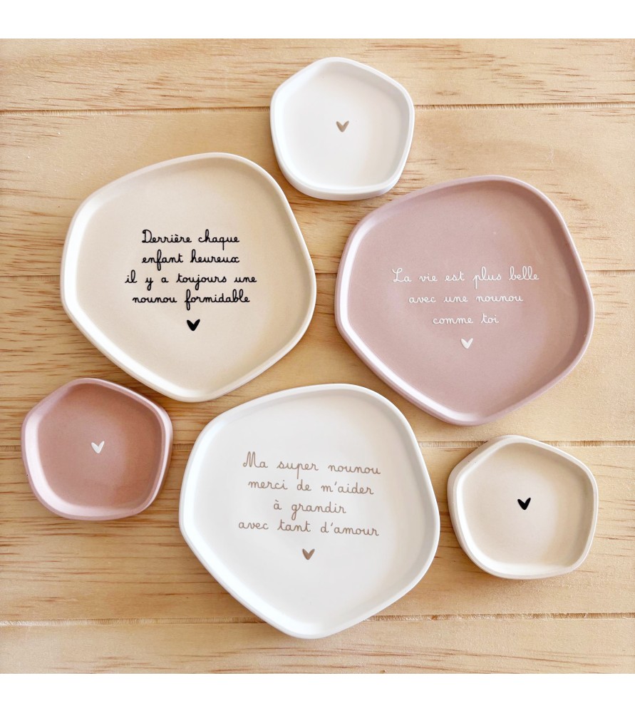 Ces coupelles sont idéales comme cadeau de fin d’année, cadeau de Noël, ou petite attention pour la fête des nounous. Elles peuvent être utilisées comme porte-bijoux, vide-poche ou simple objet décoratif dans une chambre ou un salon. Un présent tendre et symbolique pour remercier une personne précieuse avec élégance.
