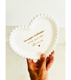 Exprimez toute votre gratitude avec cette magnifique coupelle artisanale en forme de cœur, spécialement créée pour remercier une maîtresse en fin d’année. Avec son inscription délicate "ma super maîtresse, merci pour cette belle année", elle incarne parfaitement l’émotion et l’attention que mérite celle qui a accompagné vos enfants tout au long de l’année scolaire.