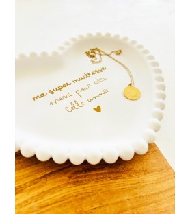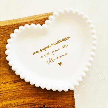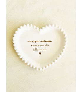 Une jolie coupelle artisanale en forme de cœur, au message tendre "ma super maîtresse, merci pour cette belle année". Un cadeau unique pour remercier une maîtresse en fin d’année scolaire.