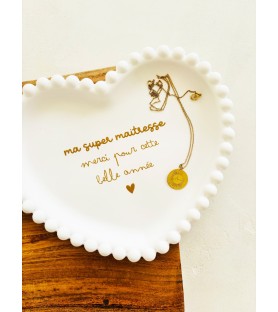 Cette coupelle est le cadeau idéal pour la fin de l’année scolaire, un anniversaire ou toute autre occasion de dire merci à une maîtresse avec originalité et élégance.
