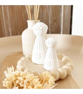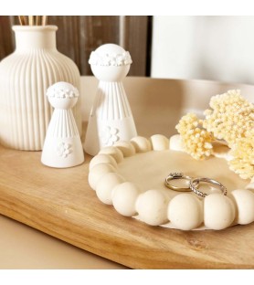 Ces figurines sont proposées soit seules, soit en ensemble avec une coupelle ronde perlée de coloris beige sienne. La coupelle apporte une base élégante et chaleureuse, tout en permettant de mettre en valeur les figurines ou d’y déposer quelques petits objets décoratifs.