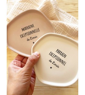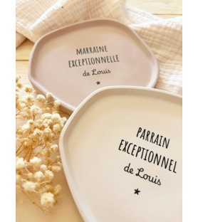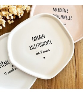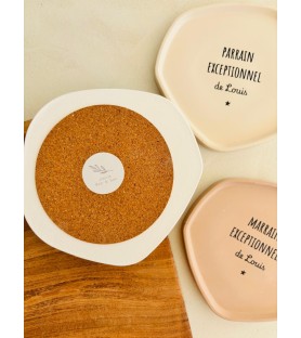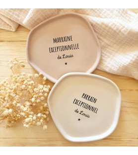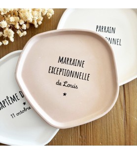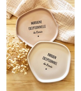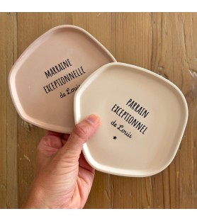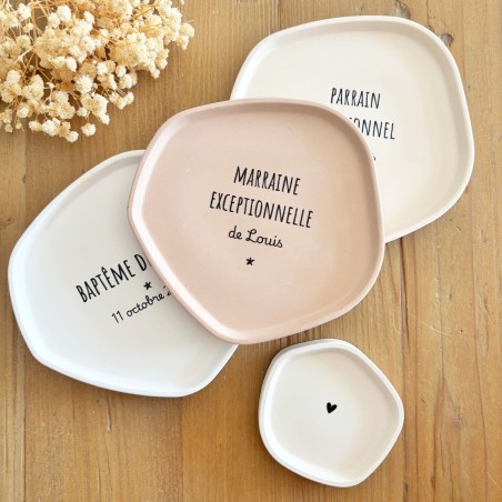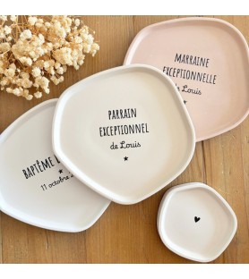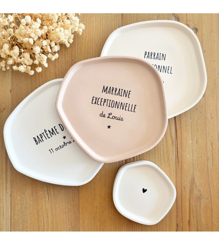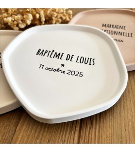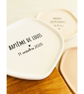 De délicates coupelles artisanales en résine, disponibles en blanc, beige naturel ou orangé doux, personnalisées avec le prénom et la date du baptême. Un souvenir unique pour gâter parrain et marraine et marquer ce jour précieux.